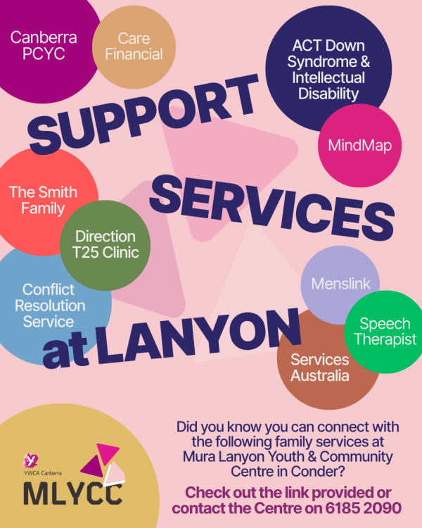 The Mura Lanyon Youth and Community Centre (MLYCC) in Conder supports community organisations to better support local families in the region. Below is a list of community services that are currently collocating at MLYCC each week/month. Community members and school and early childhood staff can drop in and/ or refer families they work with to arrange a time to have a chat with a service at the Centre. The Mura Lanyon Youth and Community Centre is located at 22 Sidney Nolan Street, Conder, free parking available.