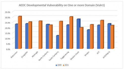 Since 2009 the AEDC data has indicated a statistically significant increase in the percentage of Tuggeranong children identified as developmentally vulnerable across 1 or more domains.